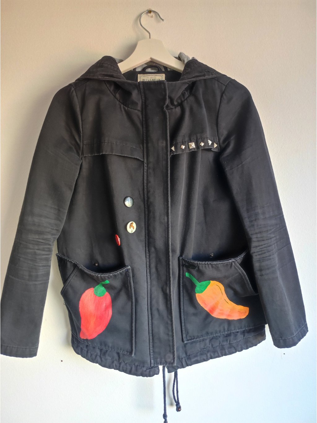Černá bunda secondhandového původu značky Pull&Bear, velikost S, materiál 100% polyester, barvy na textil, placky, pyramidky.