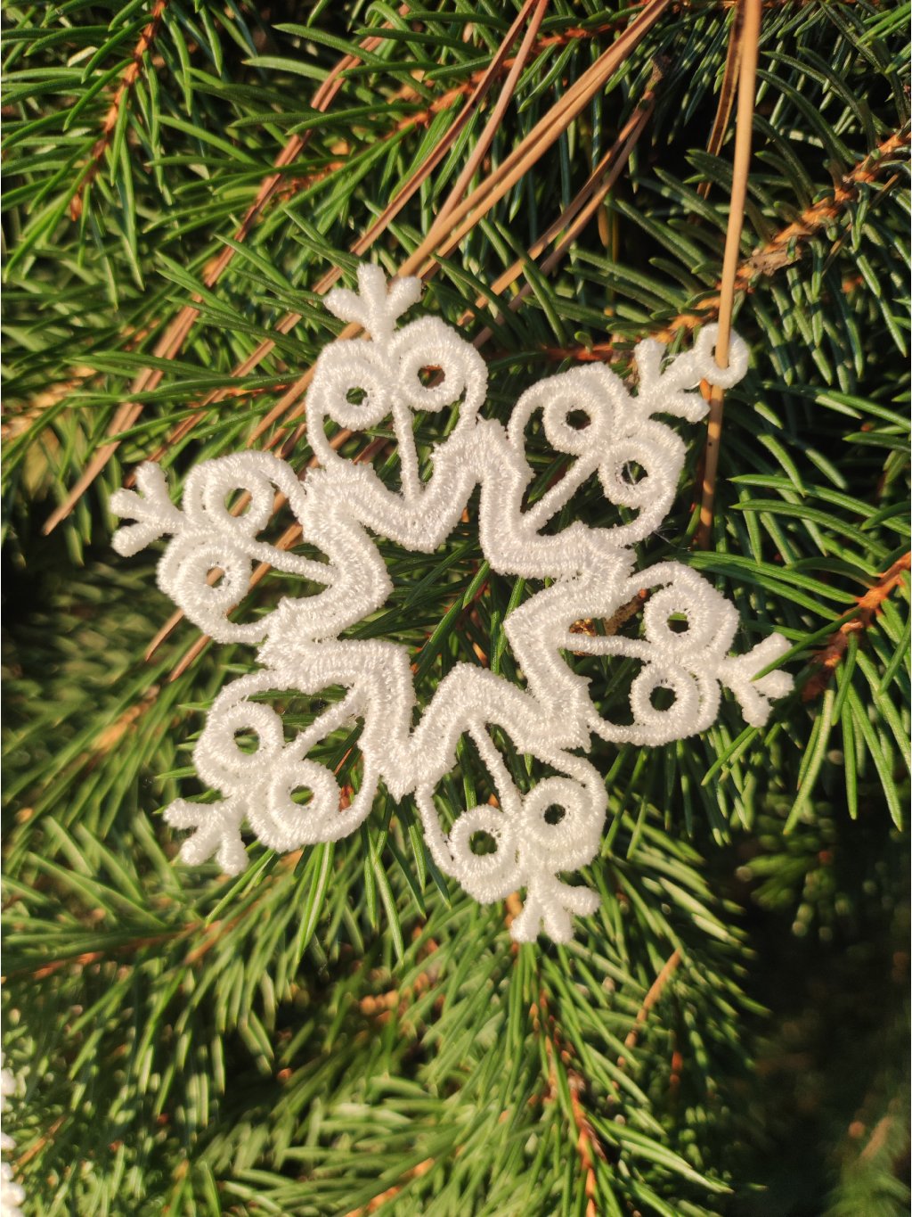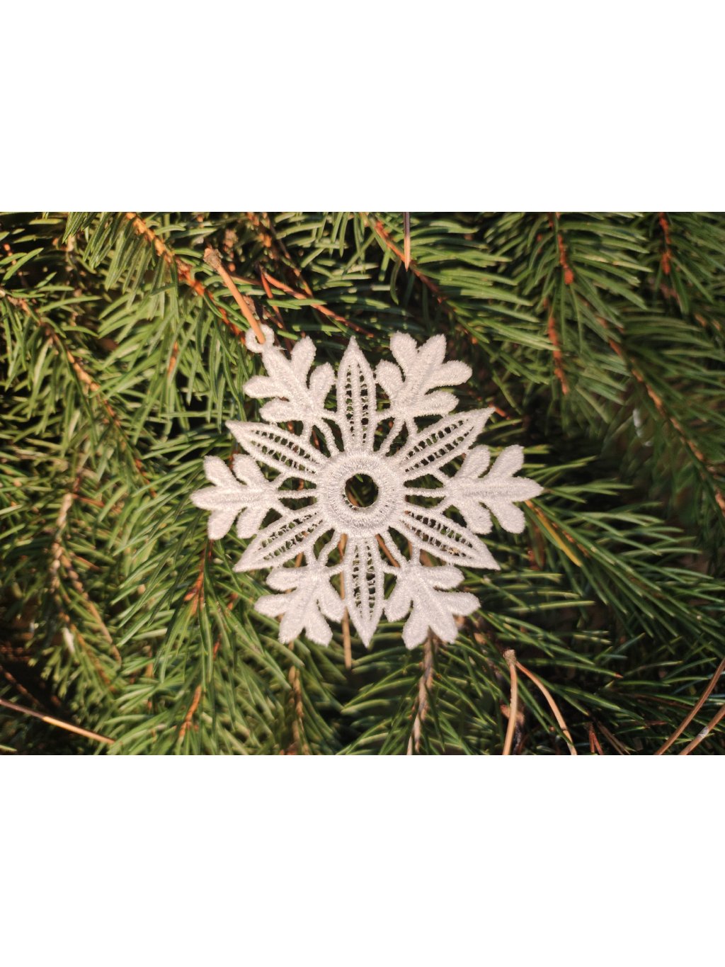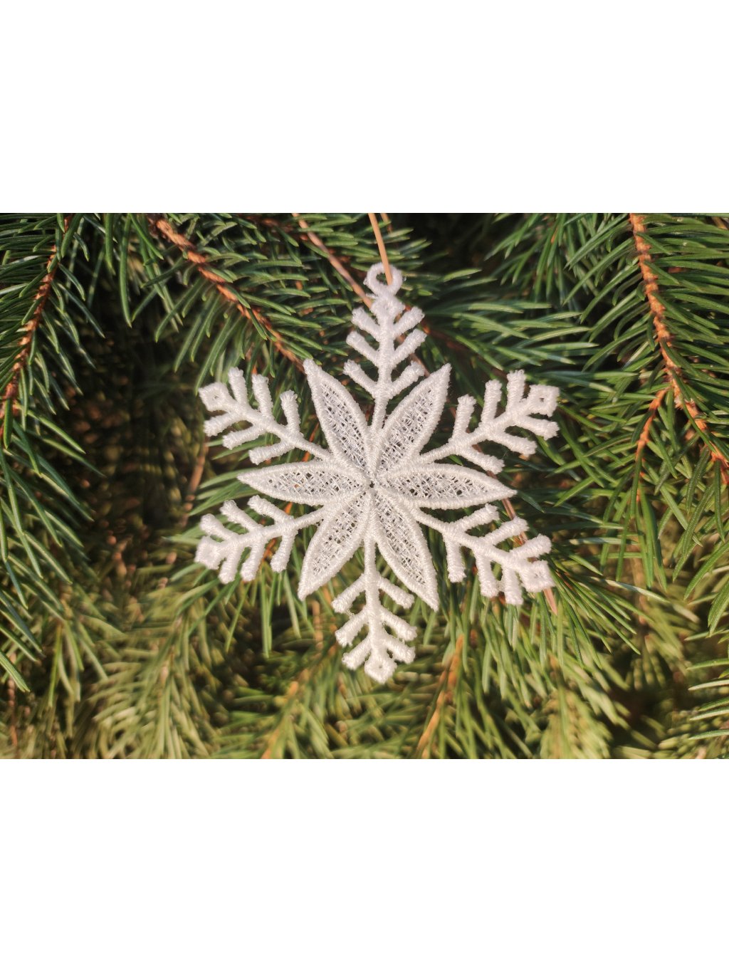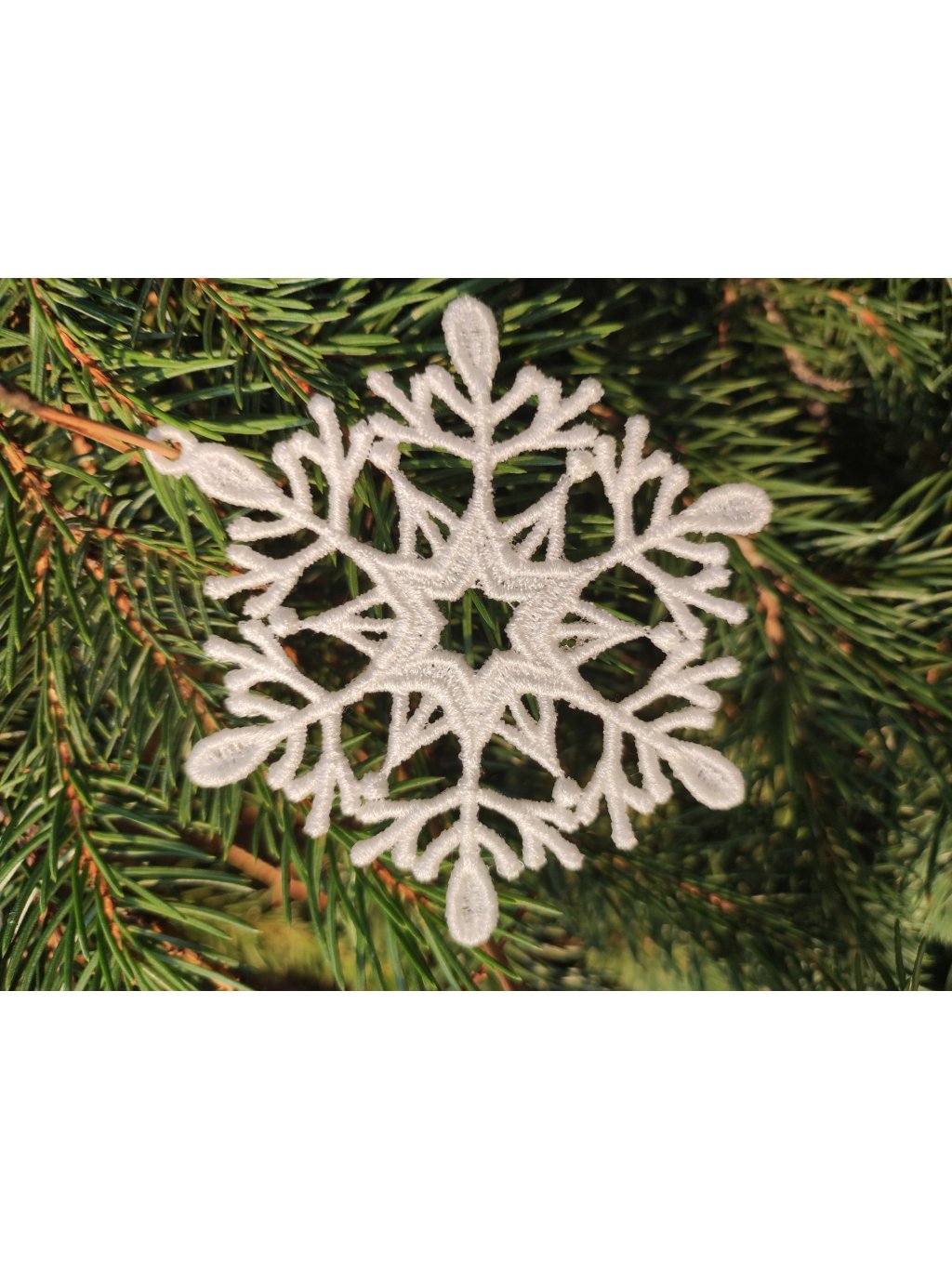 10 ks bílých krajkových vloček v krabičce. Každá vločka je jiná a má očko na pověšení. Velikost do dlaně.