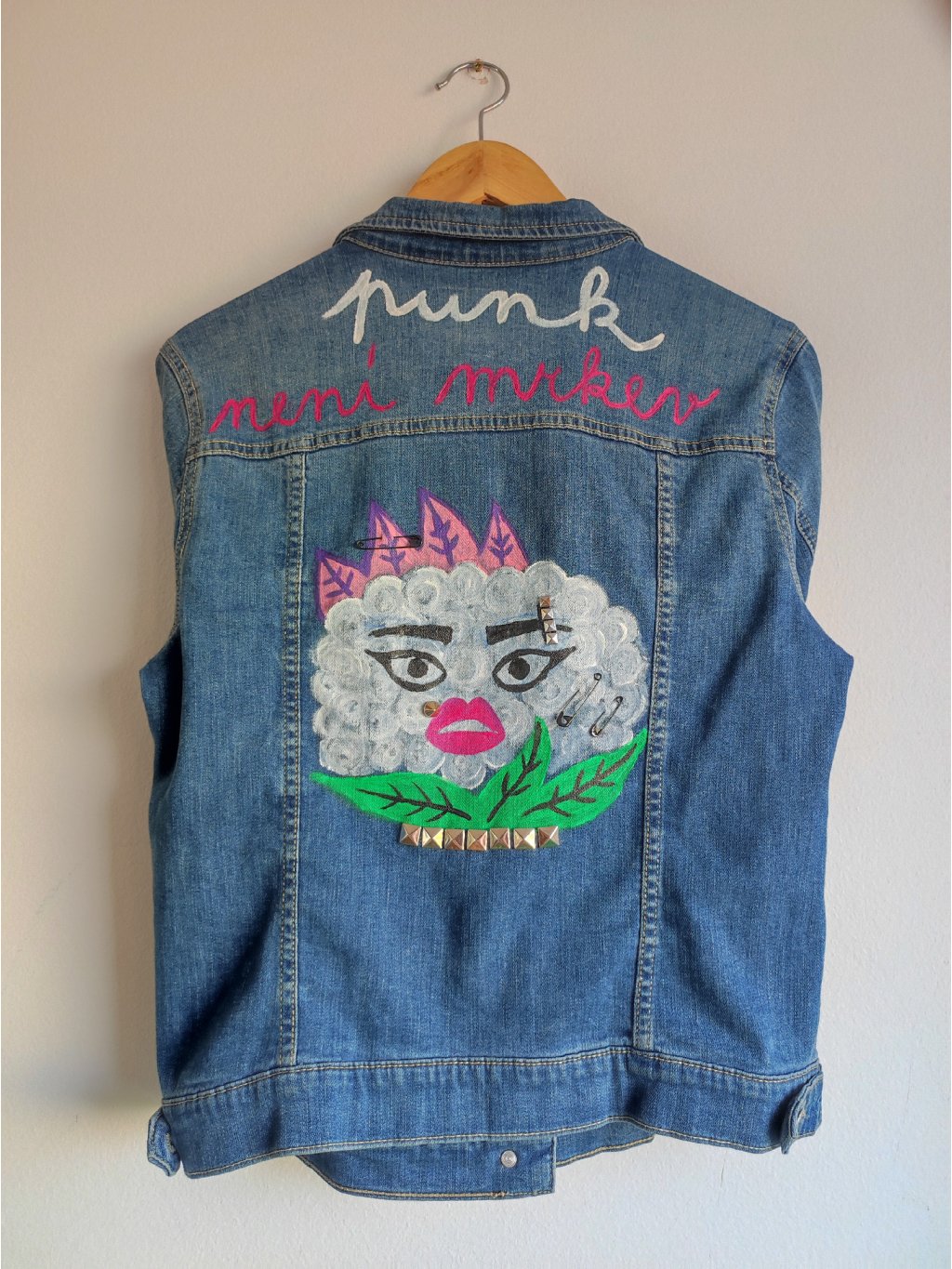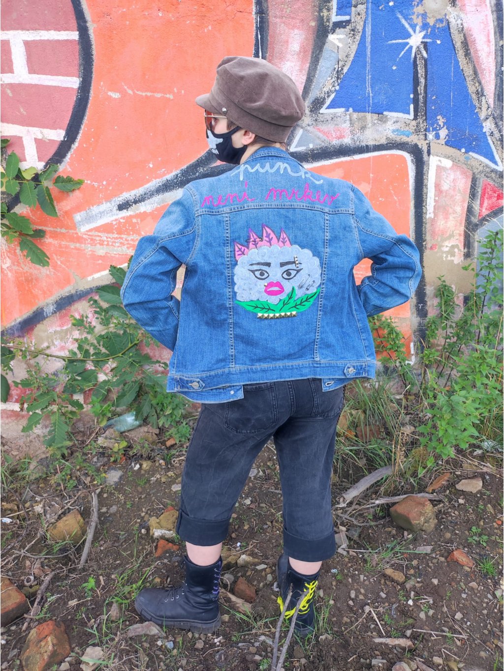 Punková princezna s květákem. Kombinace růžové barvy, černých očních linek a pyramidek.