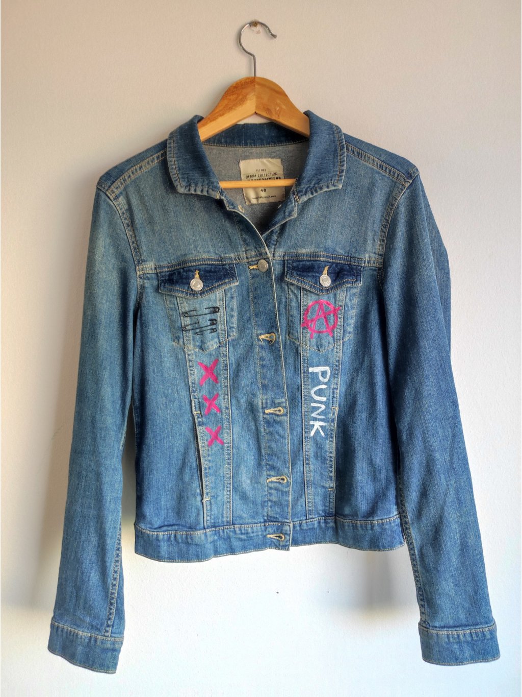 Džínová bunda secondhandového původu značky Tally Weijl, velikost 40, 98% bavlna, 2% elastan, barvy na textil, pyramidky.